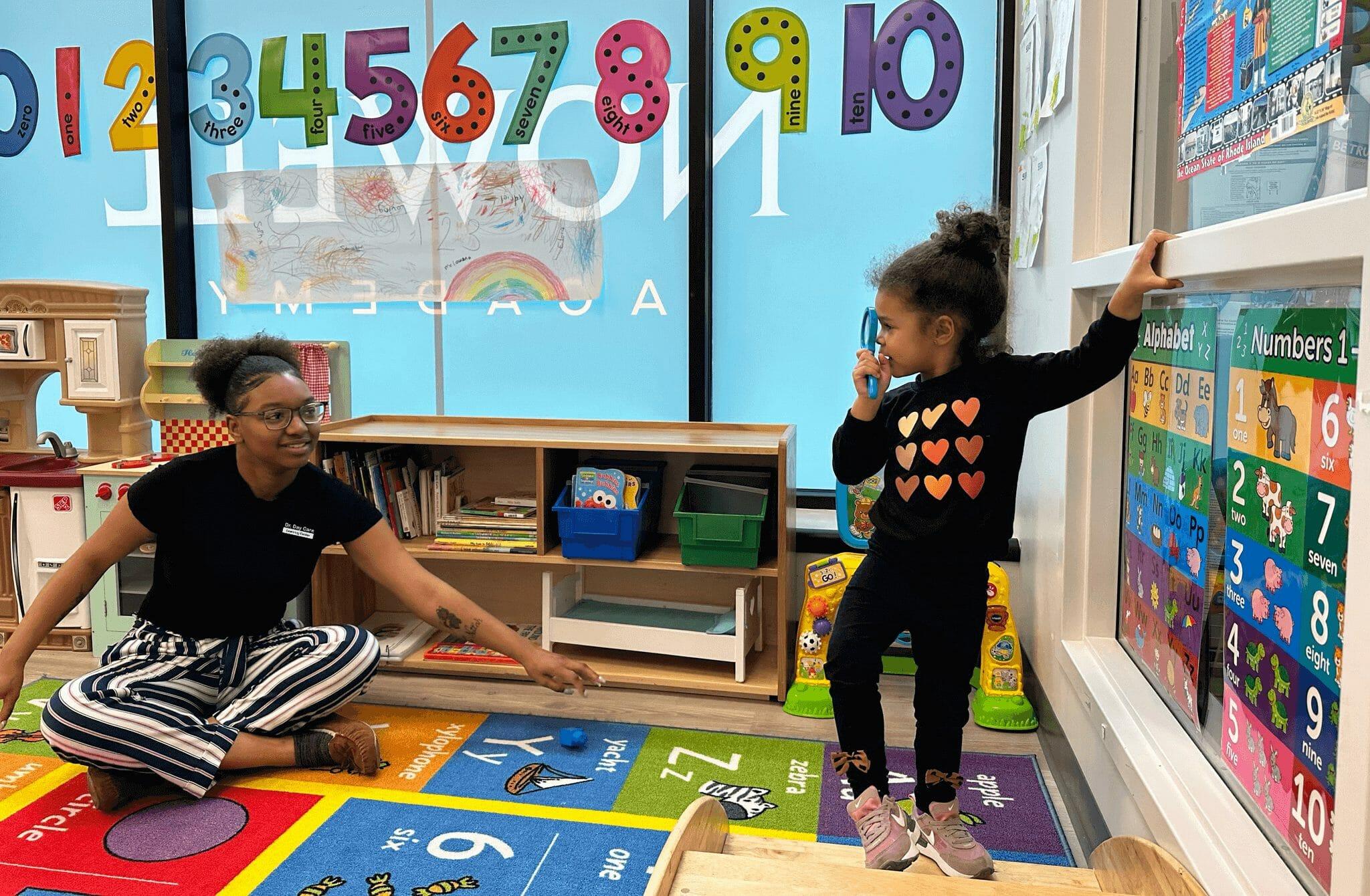 Some examples of this could be playing outside on a fall day and pointing out the leaves on the ground that you see. Count the leaves fall and talk about the different colors you see on the leaves that still on the trees. Ask your daughter to count the red leaves and then to count the yellow leaves. Ask your daughter if there are more red or yellow leaves. Don’t forget to ask open-ended questions such as why some of the leaves haven’t fallen yet. Listen to her words by reflecting back her thoughts and expanding on her response by adding more information about how trees lose their leaves in the fall. Later, read a book about trees or the changing seasons.